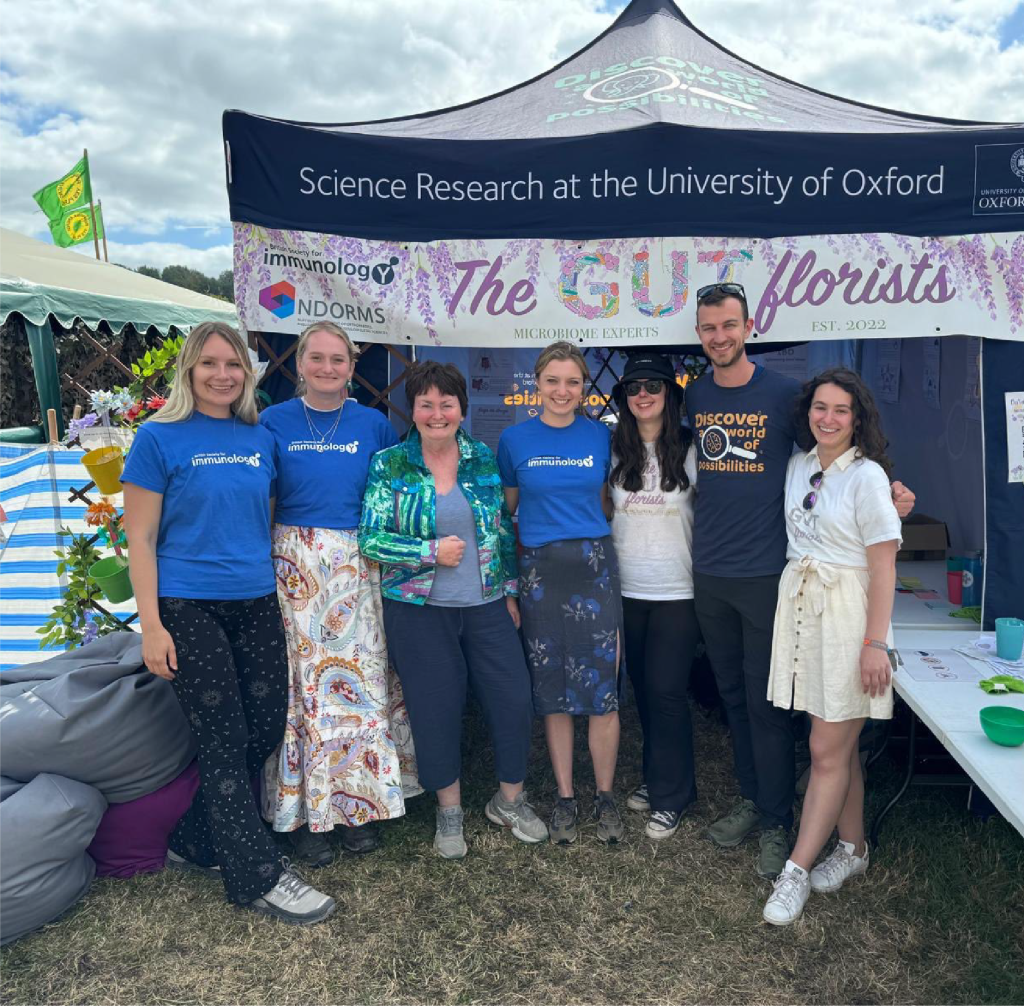 The gut microbiome is becoming a topic of conversation everywhere, and the public generally agrees that gut health is important. In a team of 6 early career researchers (aka The Gut Florists), we set up a stall at Glastonbury Music Festival 2024 to chat to the public about what the gut microbiome means to them. We discussed which claims of products and mainstream media about the gut microbiome are research-based, and what evidence may instead be correlative and anecdotal.